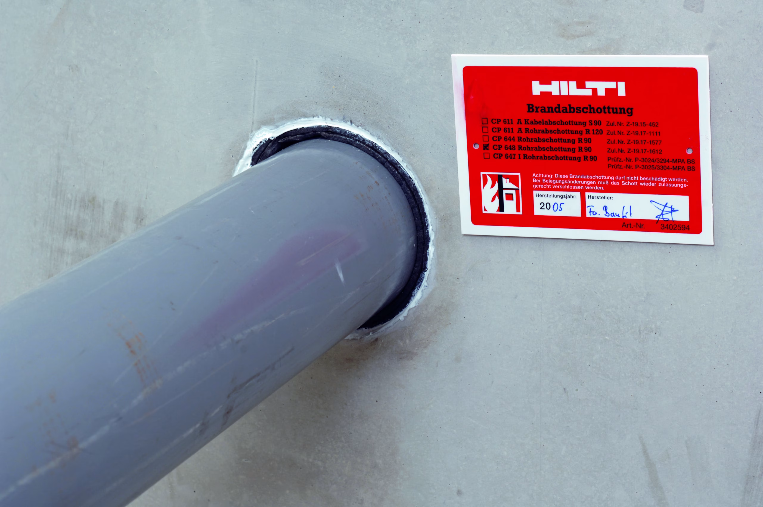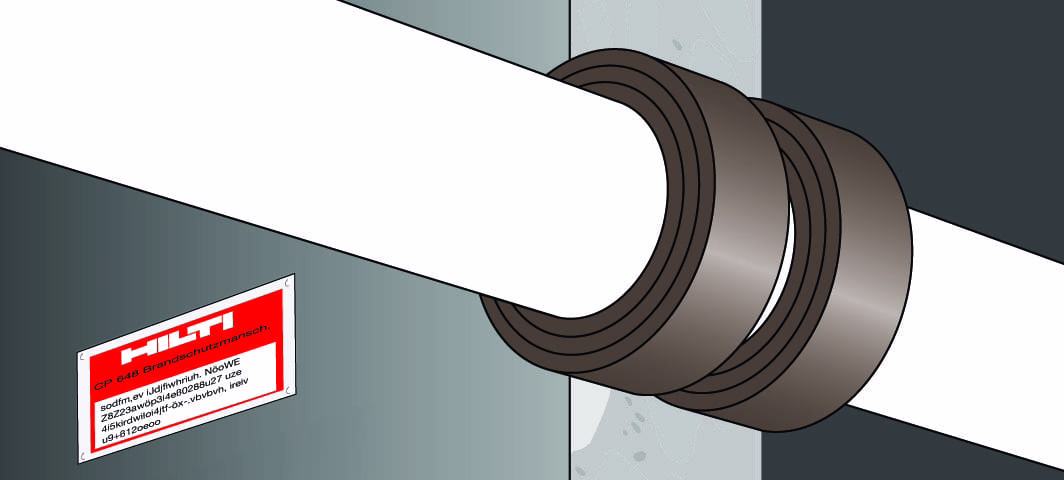 Cinta Cortafuego CP 648-E: Listón para banda intumescente flexible que ayuda a crear una barrera contra el fuego y el humo en atravesamientos de tuberías combustibles.